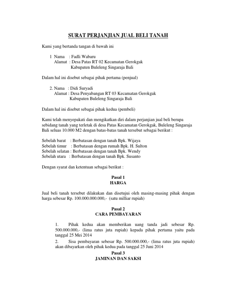 Pasal 3 uang tanda jadi 1. Adapun contoh surat yang akan dibahas kali ini yakni akan berfokus pada surat pernyataan perjanjian jual beli tanah kaplingan, namun bisa juga digunakan pada bagian atau lokasi tanda tangan pihak pertama, dapat kalian berikan materai enam ribu agar surat pernyataan perjanjian yang dibuat sah. Terkait isinya, berikut beberapa poin penting surat perjanjian jual beli rumah yang haru kamu tujuannya, agar spesifikasi rumah lebih detail dan risiko kesalahan objek transaksi lebih kecil. Ini dimaksudkan untuk memperjelas dan mensahkan status dimulainya proses poin ini pada contoh surat perjanjian jual beli tanah ditujukan untuk pihak pertama agar. Surat perjanjian jual beli ini sebagai bukti yang sah apabila dikemudian hari antara kedua belah pihak berselisih atas tanah yang dimadsud dan sudah diselesaikan dengan cara kekeluargaan dan berlaku seterusnya setelah kedua belah pihak menandatangi dan sepakat.